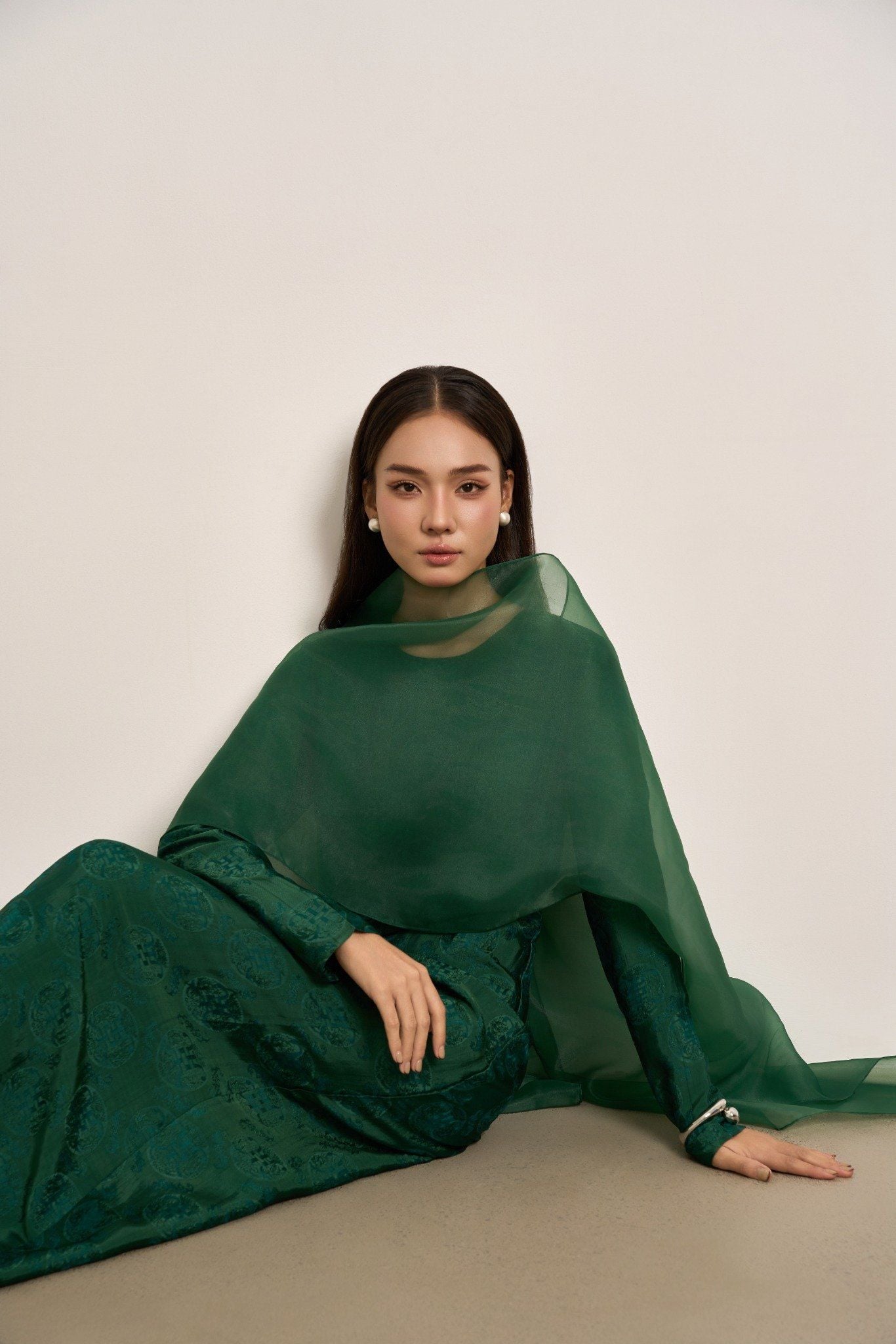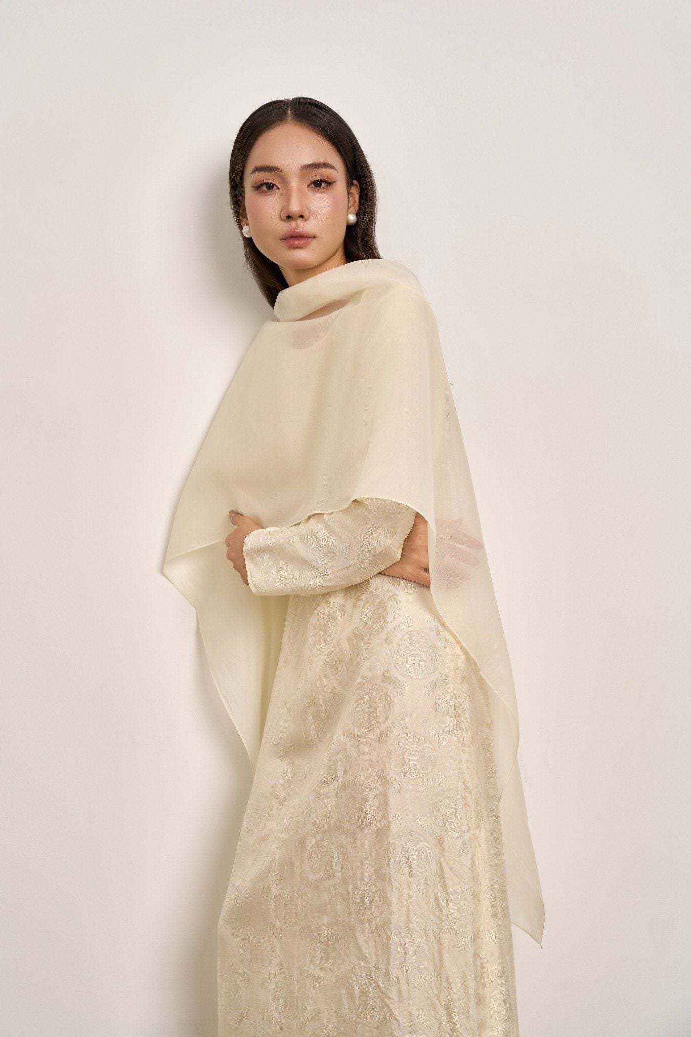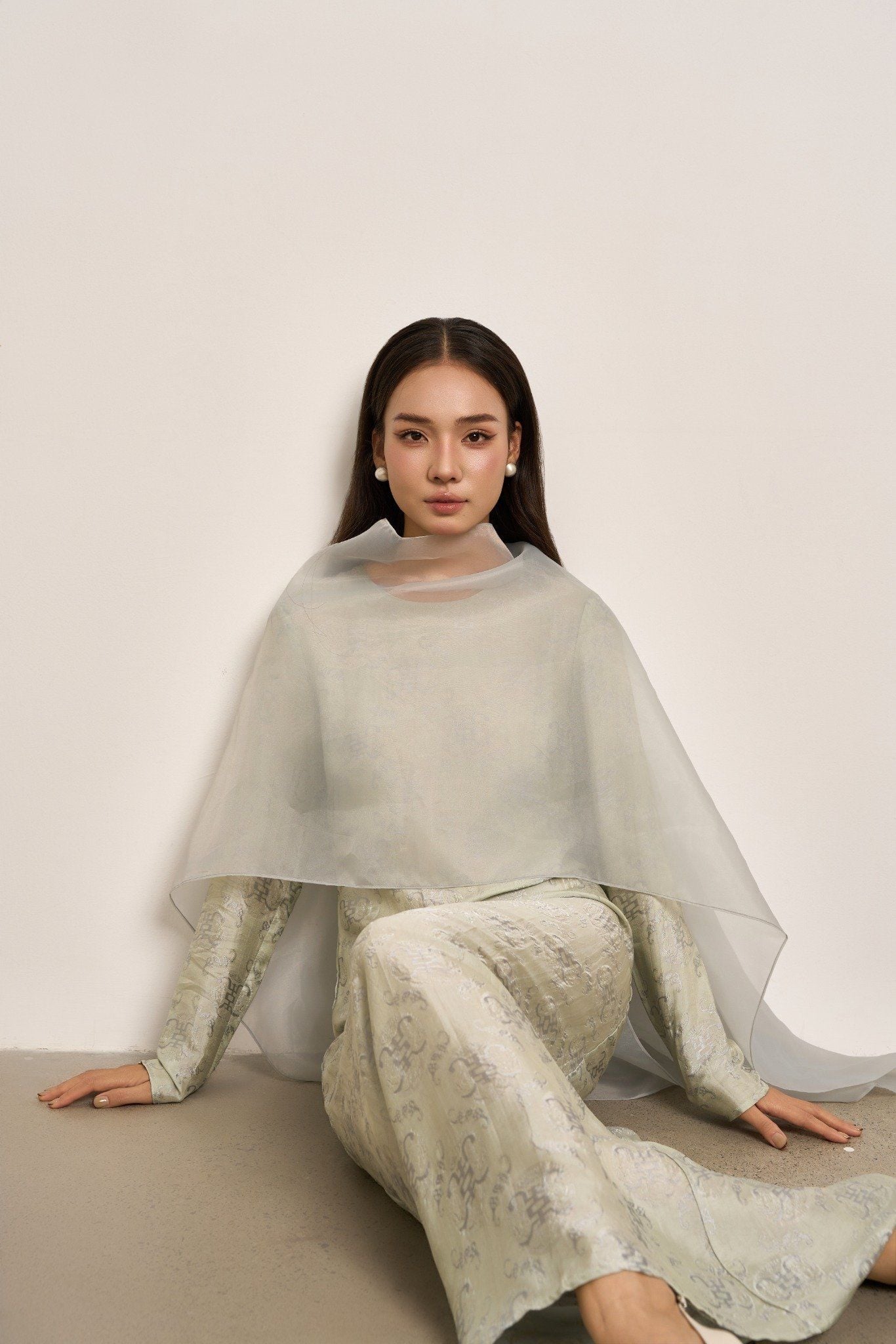 Soeur Studio lựa chọn lụa tơ tằm Nha Xá mang độ bóng dịu và cảm giác rủ mềm đặc trưng. Kết hợp cùng khăn choàng organza trong suốt cùng tone, như một lớp chạm thanh thoát làm tăng chiều sâu nữ tính