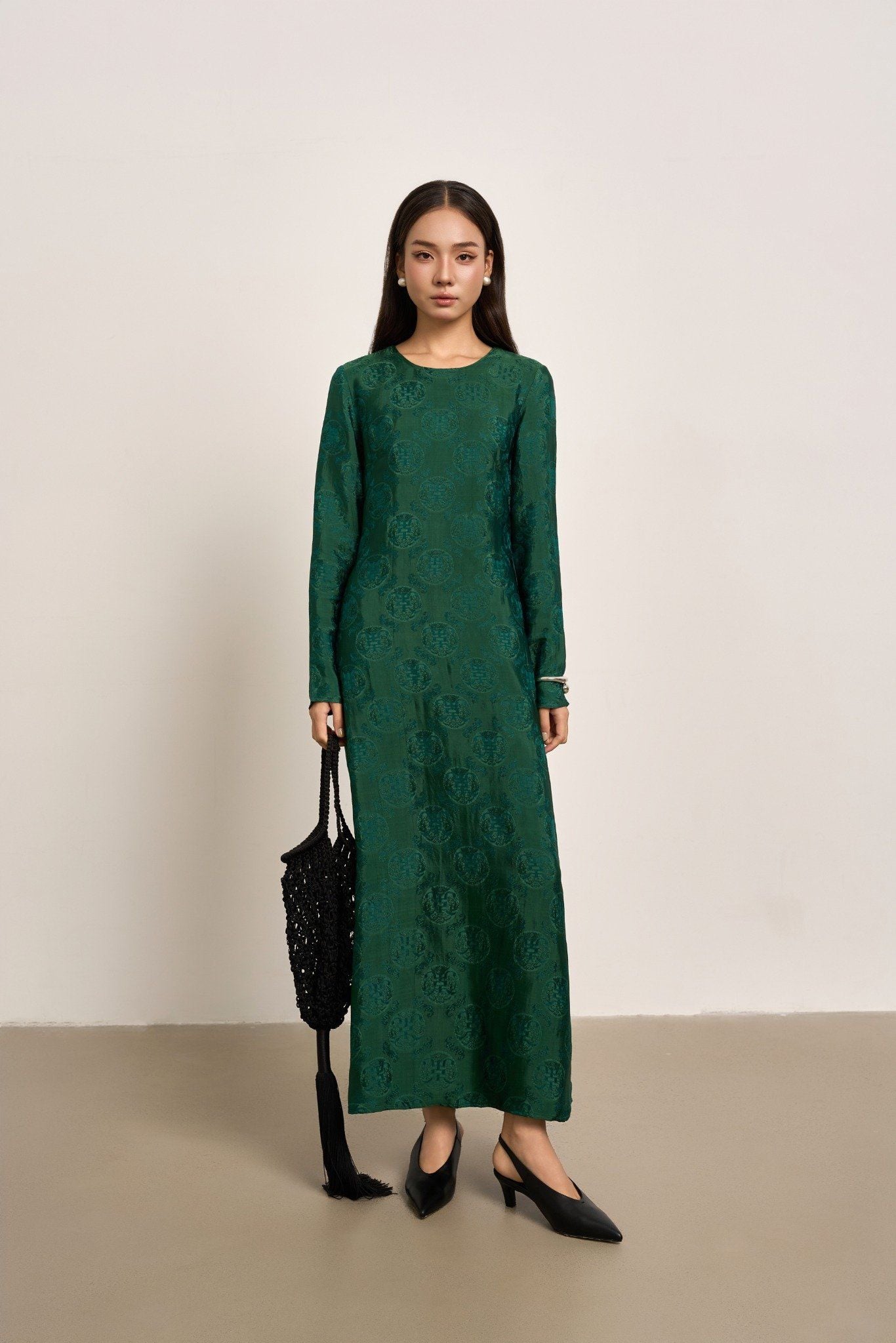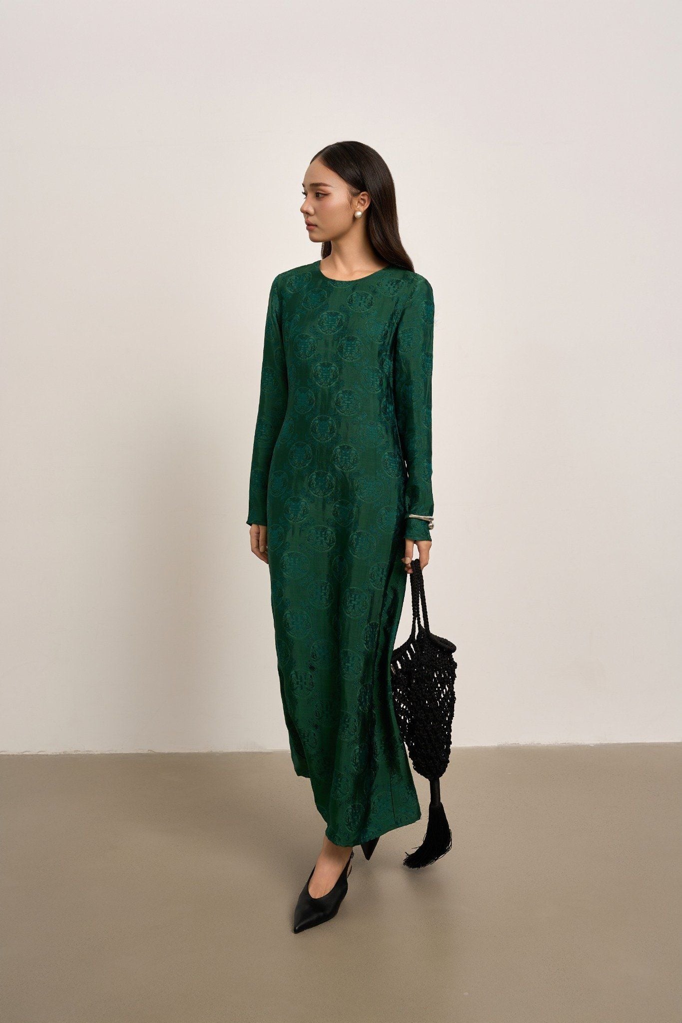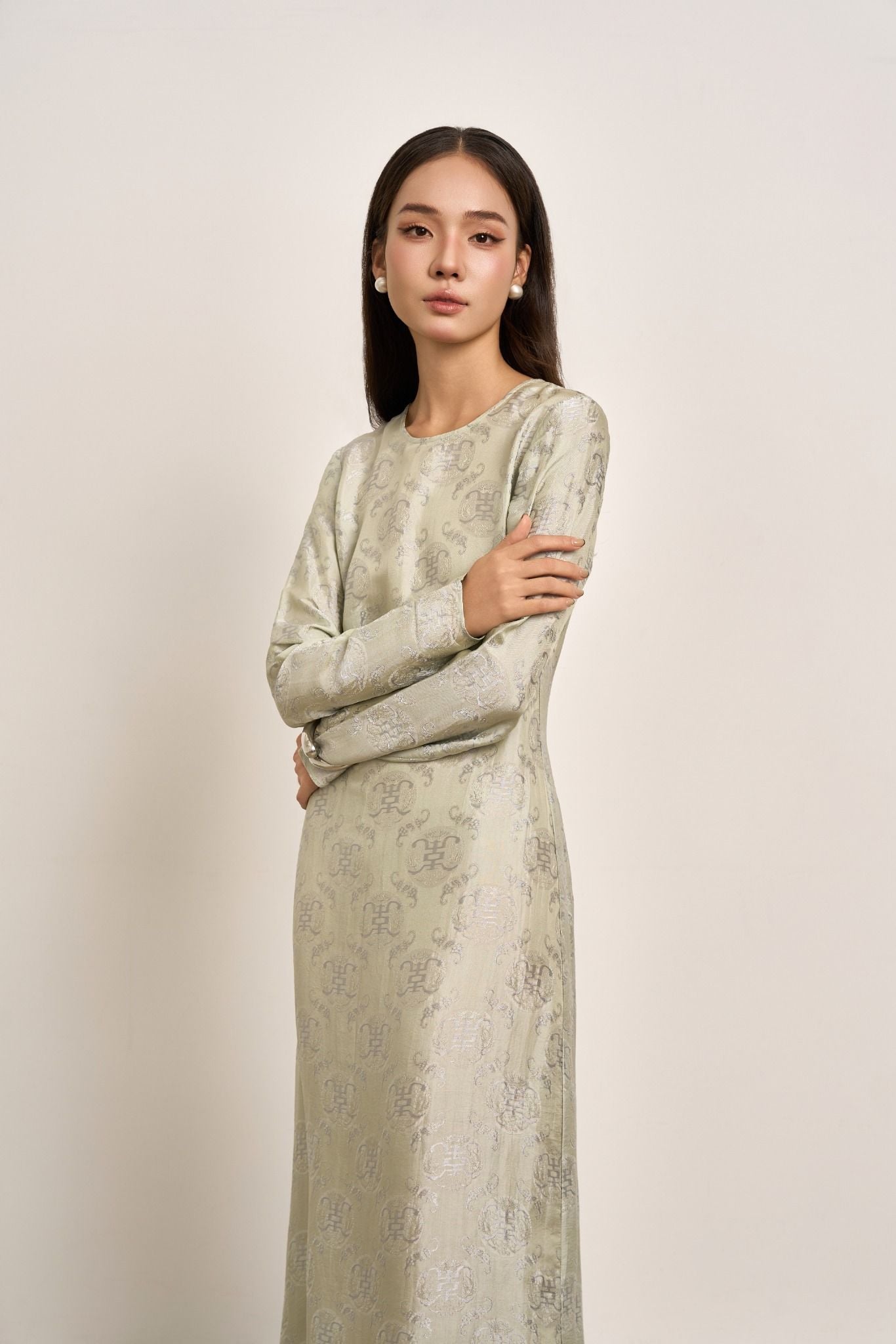 Soeur Studio lựa chọn lụa tơ tằm Nha Xá mang độ bóng dịu và cảm giác rủ mềm đặc trưng. Kết hợp cùng khăn choàng organza trong suốt cùng tone, như một lớp chạm thanh thoát làm tăng chiều sâu nữ tính