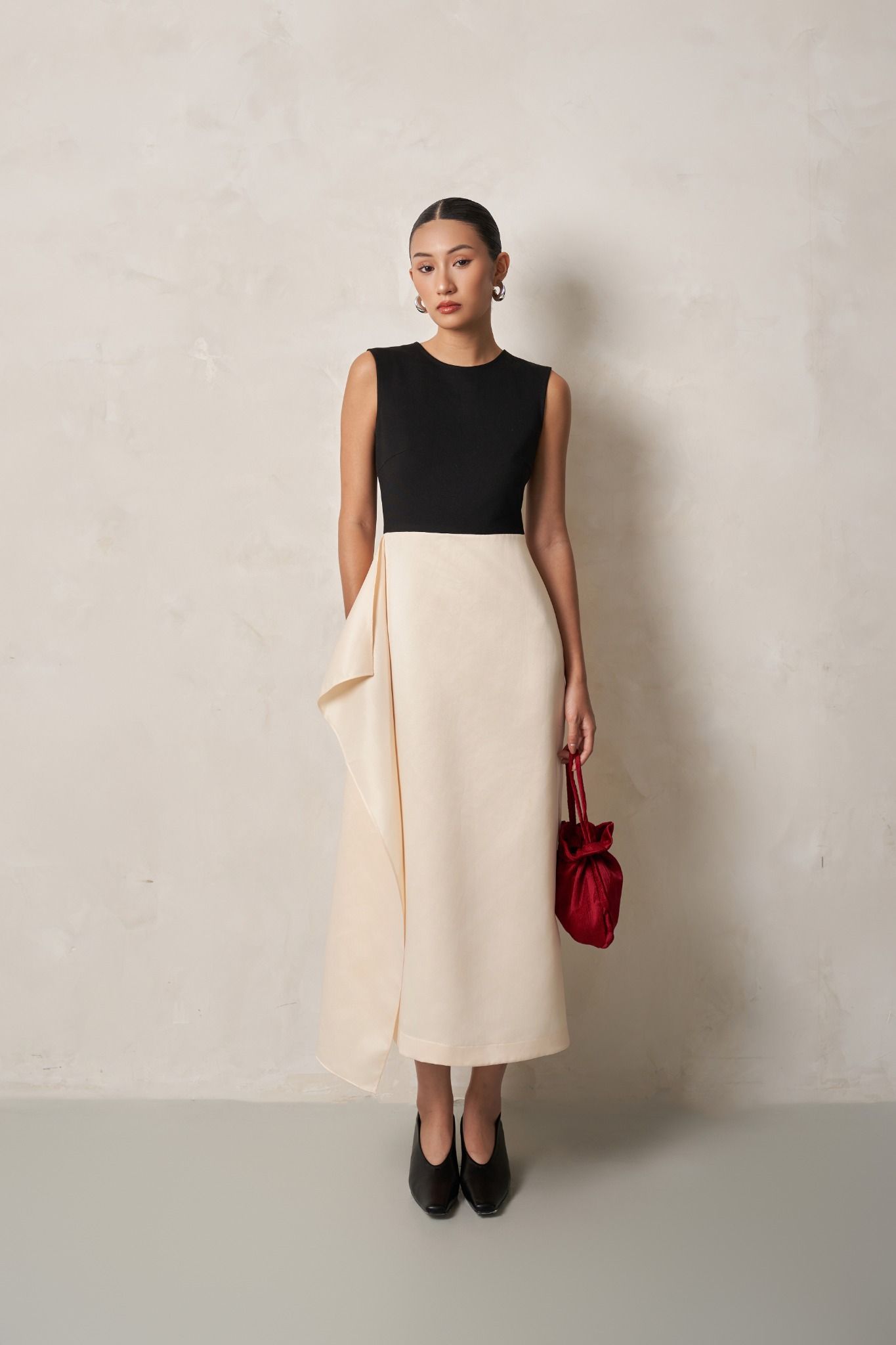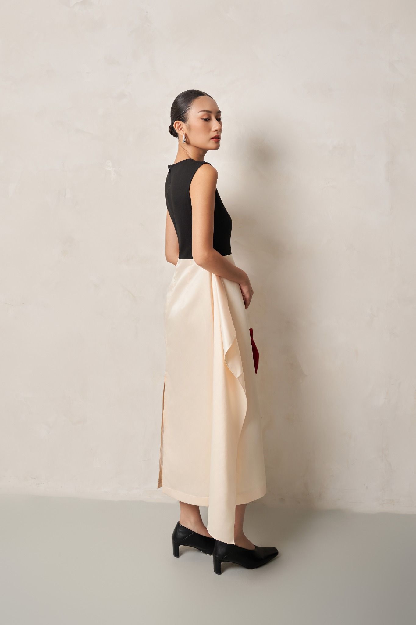 Điểm nhấn drape tinh tế ở hông tạo hiệu ứng thị giác độc đáo mang lại phong cách tối giản, nữ tính và thanh lịch cho người mặc.