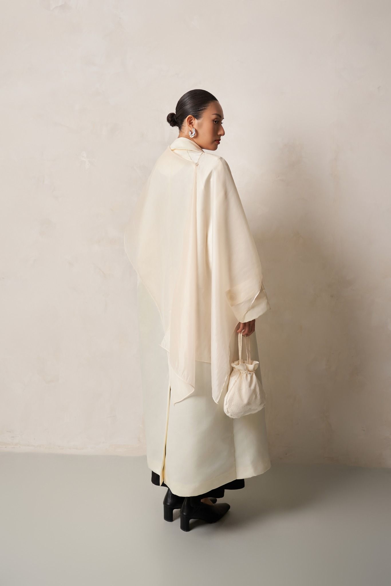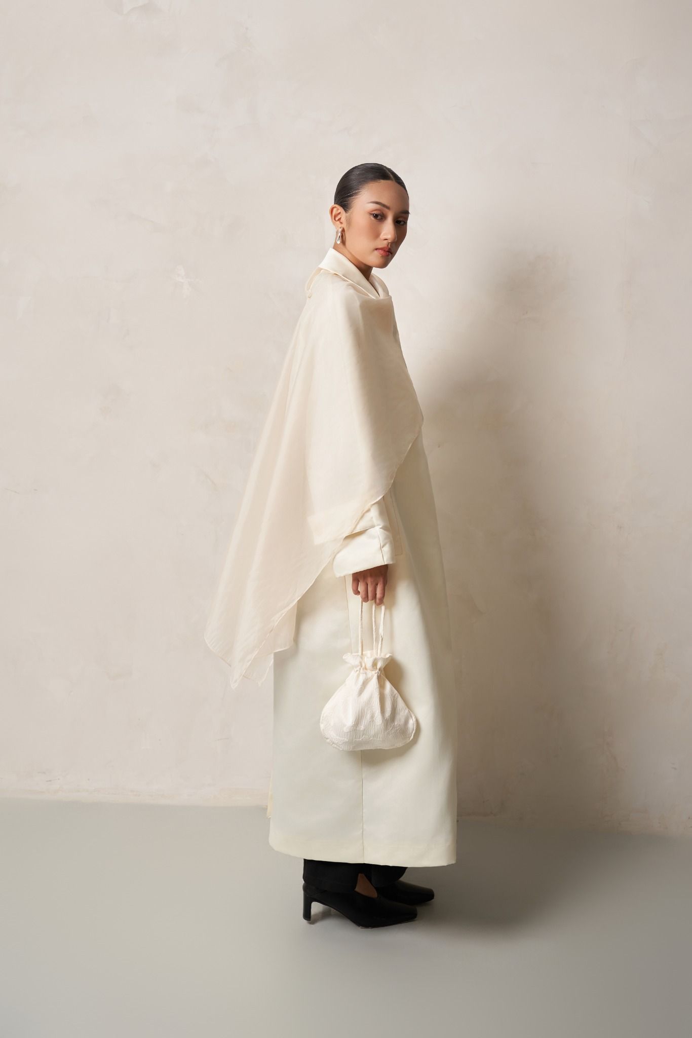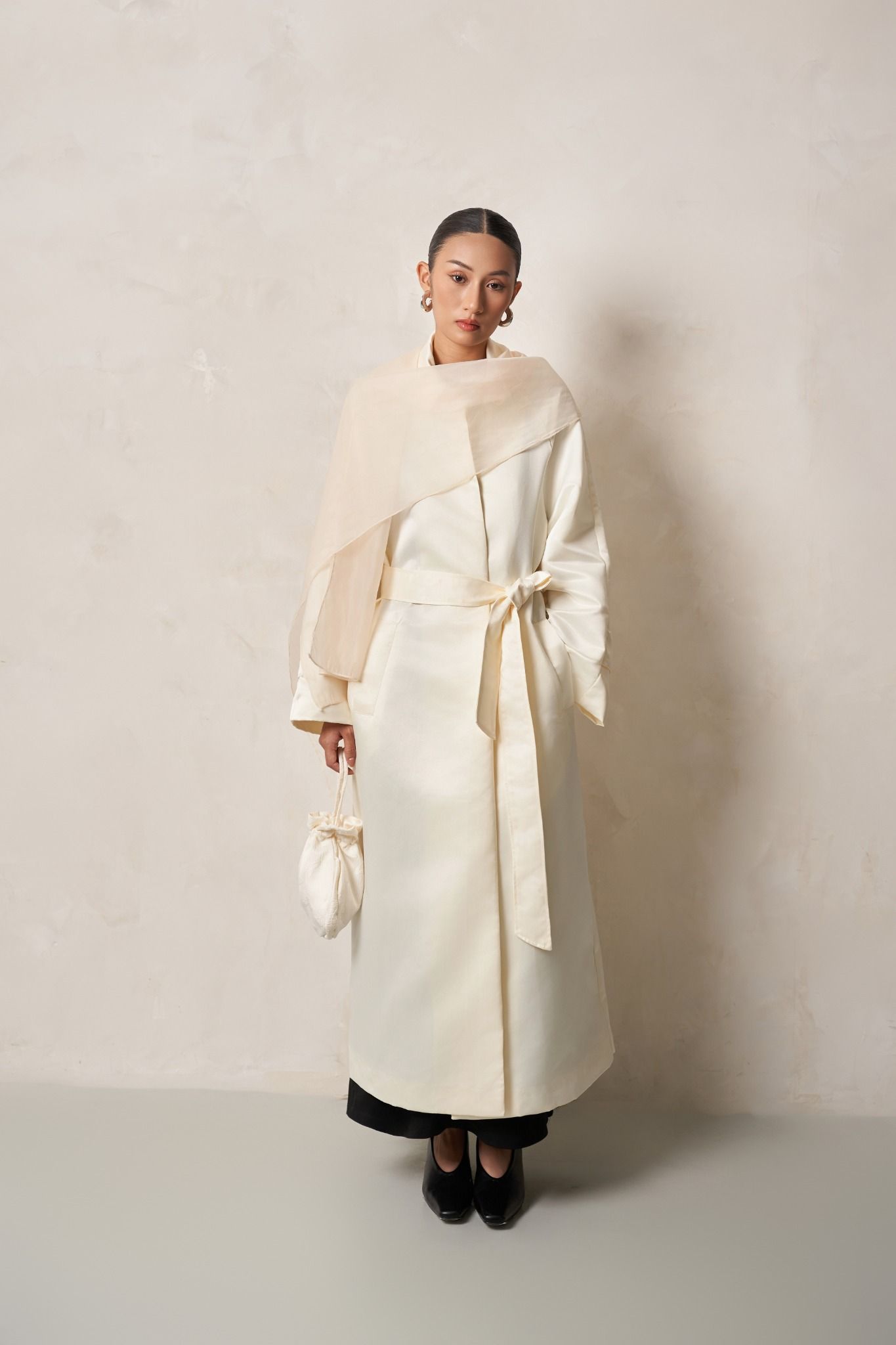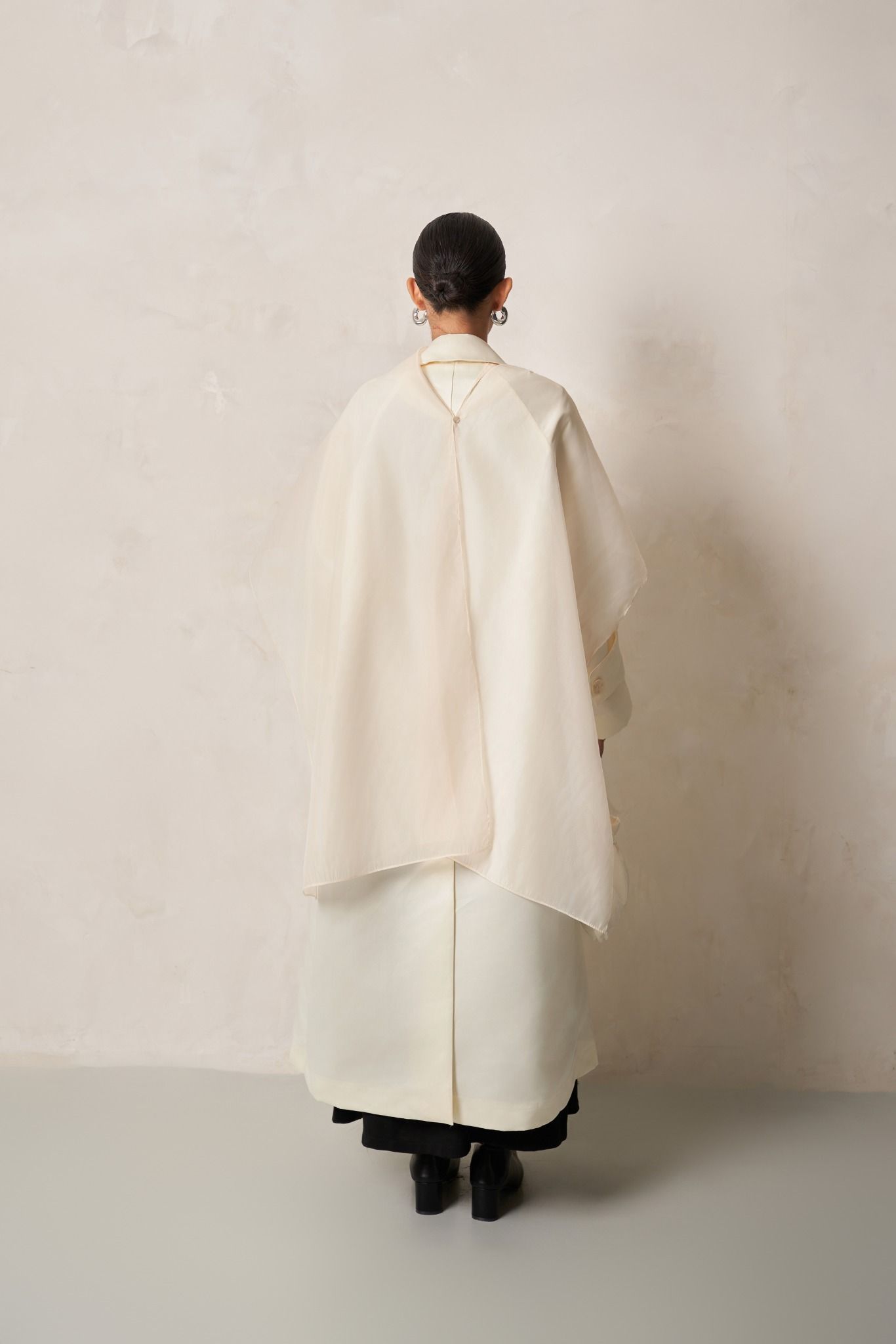 Mẫu áo trenchcoat quen thuộc được làm mới lại trên nền chất liệu taffeta sang trọng cùng điểm nhấn là chiếc khăn choàng organza mỏng nhẹ, trong suốt, giúp tăng thêm nét duyên dáng, bay bổng và tinh tế.