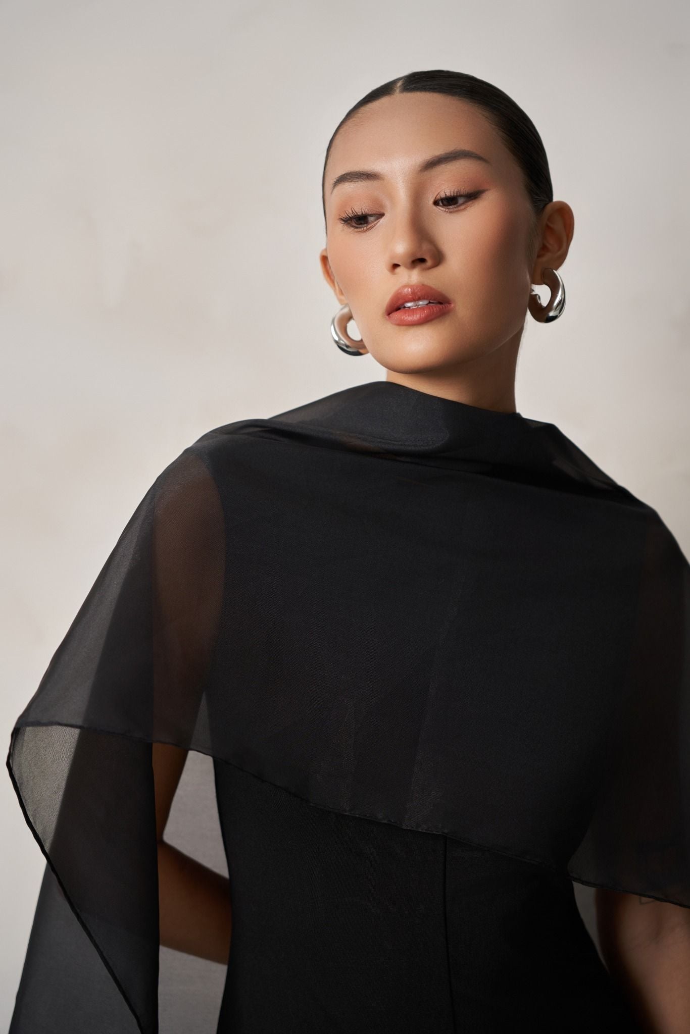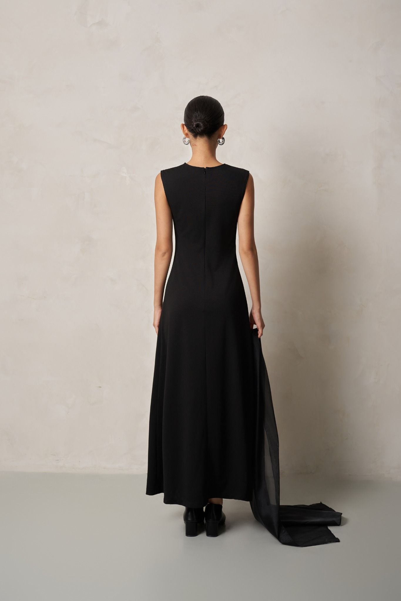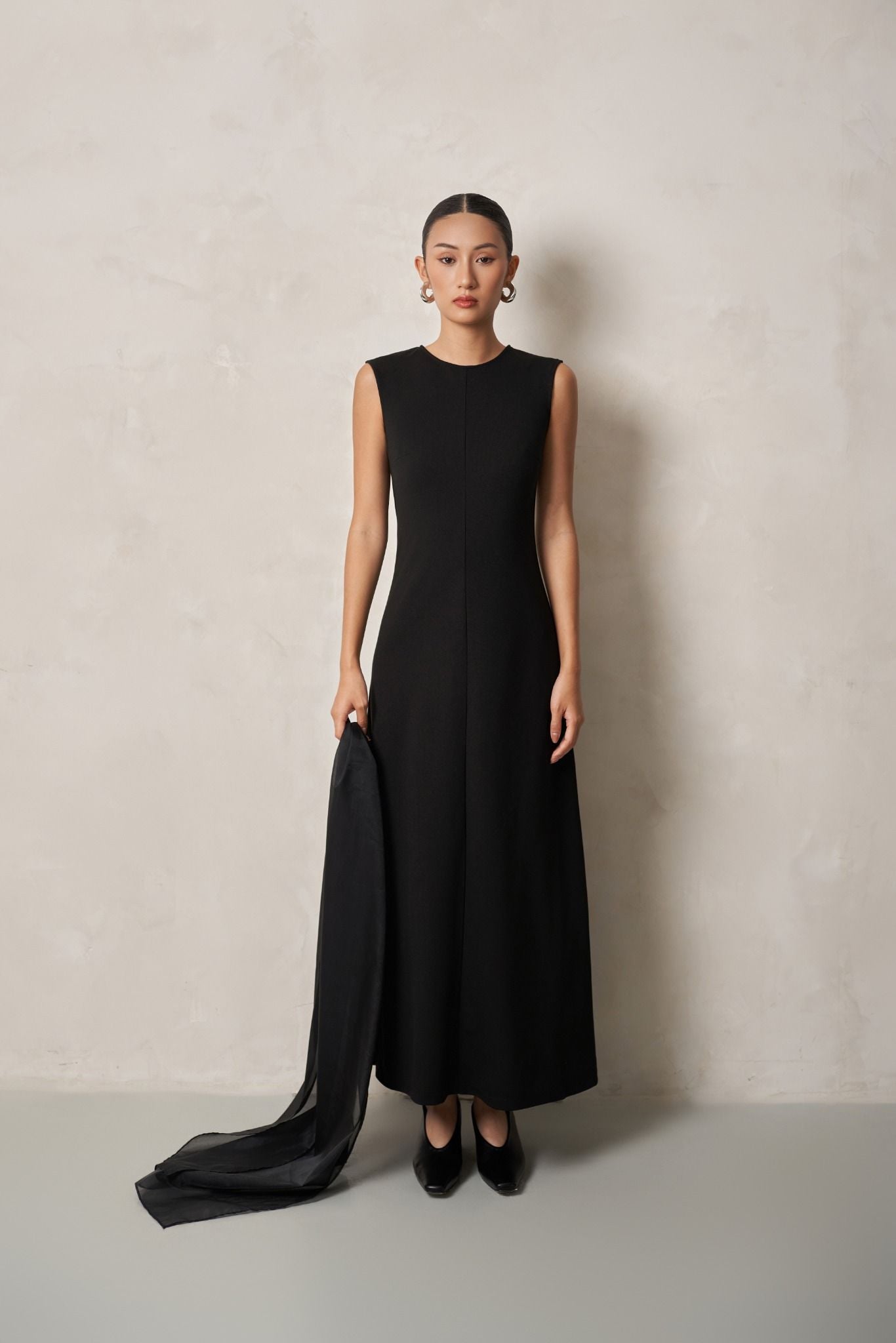 Đầm sử dụng chất liệu thun Interlock mềm mại, co giãn tốt, với điểm nhấn là chiếc khăn choàng organza mỏng nhẹ, thanh thoát, vừa tăng thêm nét mềm mại, vừa làm nổi bật vẻ đẹp tối giản mà sang trọng.